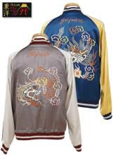 対してリバーシブル面はヴィンテージでも非常に珍しいパープルグレーのアセテート生地を使用。身頃の配色だけでなくリブの配色、龍の顔の向きや身体をうねらせた構図など、両面とも白龍をモチーフとしているのに、表裏が対となる仕上がりとなっている。胸の鷲は両面とも同じ絵柄だが、これは当時の職人が同じ「刺繍型」を使って製作していたためで、ヴィンテージに準じて本作でもそれぞれベースの色に合わせて刺繍の色糸を変えている。