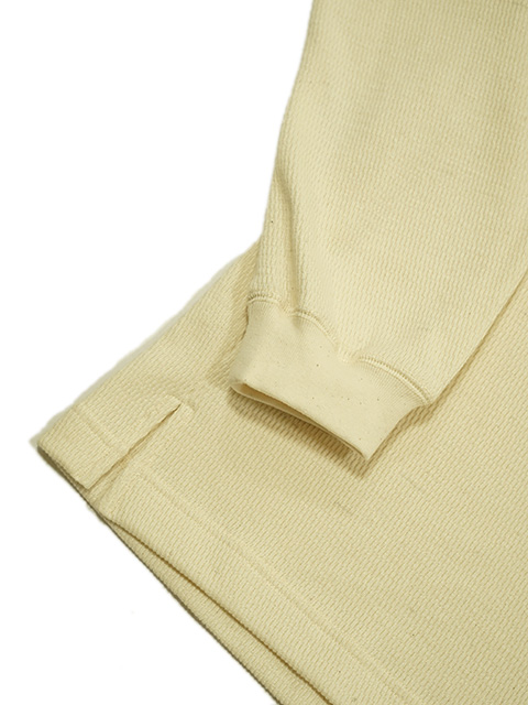 1940sのSweden armyのunderwearのモチーフにアップデート。スウェットなどの下から顔を覗かせる様に丈は気持ち⻑め。素材はWOOLのハニカム素材を使⽤。ウールは北海道で育った⽺から採れた⽺⽑を使い、⽇本で紡績した純国産ウールになります。⼿作業で洗⽑を⾏い、天⽇⼲しで乾燥させることで、環境に優しい国産ウールを復活させました。北海道の⽺から採れた純国産ウールの希少性と独特の⾵合いをお楽しみいただける1着になります。
