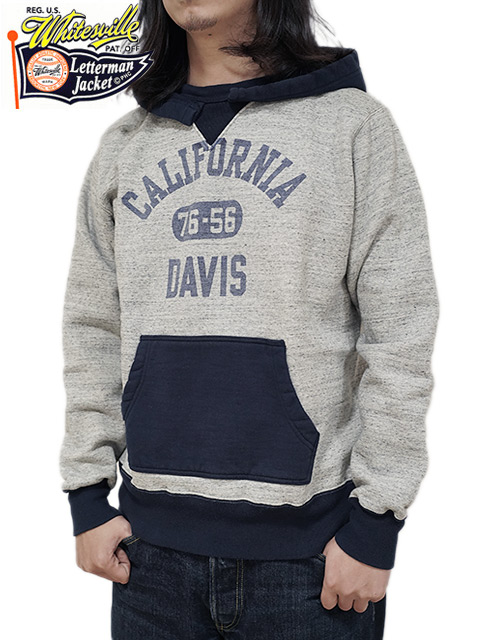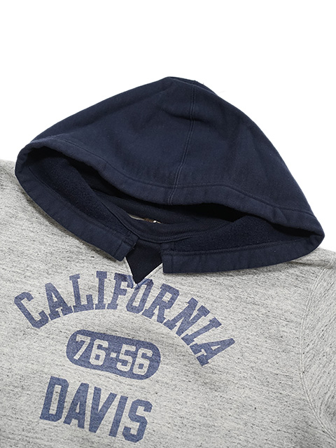 デザインは1950年代以前にみられる通称「後付けパーカ」。その名の通り、クルーネックに後からフードを付けられ、フロントにはカンガルーポケットが付きます。ヴィンテージ市場でも高額で取引され、プリント入りもレアになります。こちらはカリフォルニア州デービス大学「CALIFORNIA DAVIS」のカレッジデザインが染込みプリントされています。