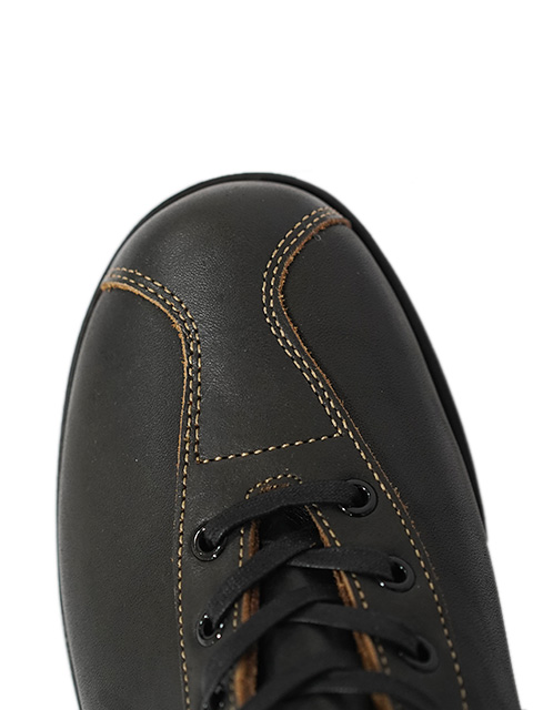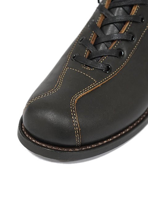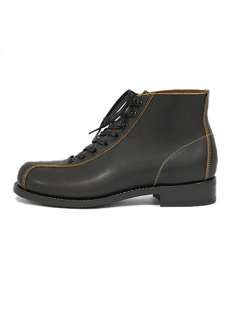 しっかりと目が詰まったダブルショルダー(牛の左右の肩の部位)の革を用いているため、トラ模様が入ることがありますが、革が本来持つ自然な表情として楽しんでいただけると思います。20世紀初めにアメリカで、ブーツによく使われていた黒に近いダークグレイ 「ガンメタル」 はブラックブーツのハードな印象は無く非常に合わせやすいカラーに仕上がっています。