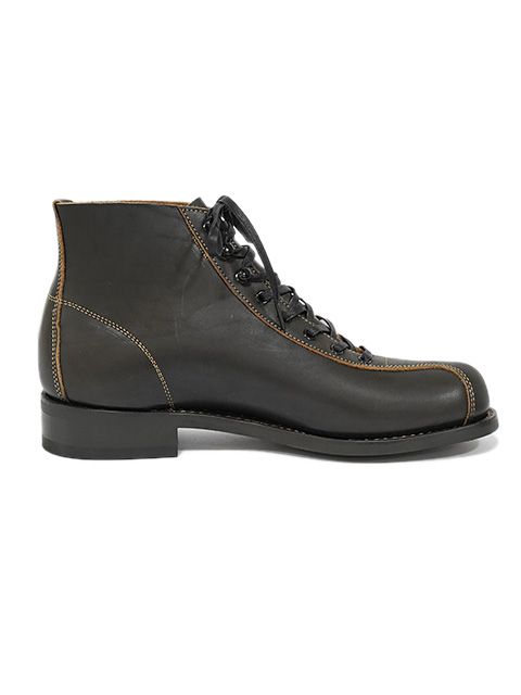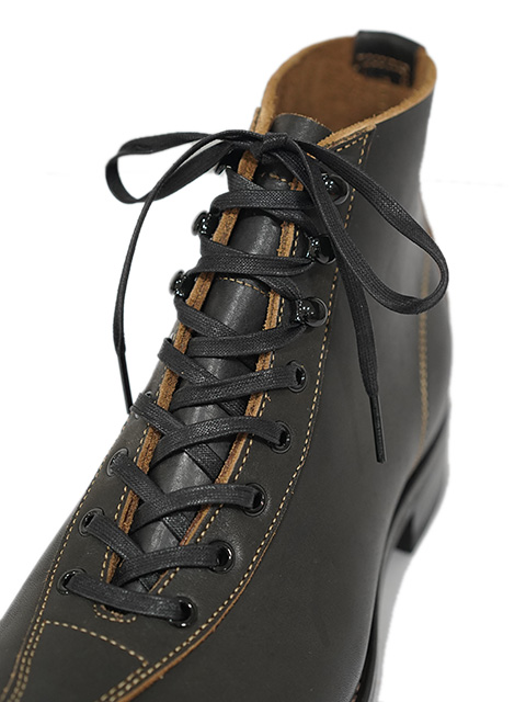 「The 2 Monkeys」の新たなブーツ RANDONNÉE (ランドネ)は、アメリカで 20世紀初めに登場した「アウティングブーツ」「スカウトブーツ」などと呼ばれたブーツをモチーフとしたものです。サイドをそれぞれ一枚の革パーツで作ってつま先とカカトで縫い合わせ、センターに紐通しからキャップへ続く革パーツを取り付けた構造の、このアッパーデザインは、1880年頃から野球やフットボールのスパイクなどに用いられていたもので、サイドに革の縫い合わせがないことや、つま先近くまで紐を通せることで足にしっかりフィットさせられるからでしょう。