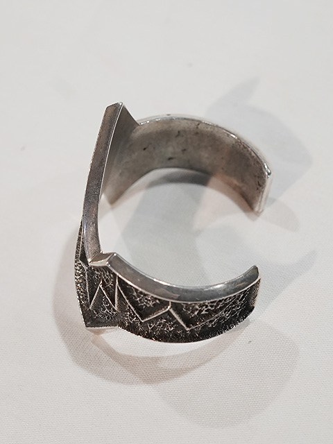 スタンプワークなどとは違い、トゥファキャストを掘る段階でのミスは修正が効かず緻密で繊細な技術を要します。トゥファキャストを使用した作品の特徴として、表面に石目のザラザラが表現さたものが多く、光沢がなく渋い雰囲気のインディアンジュエリーとなります。