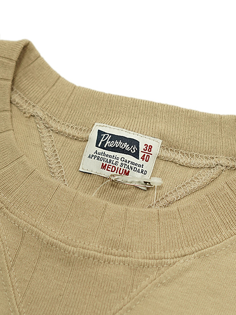 生地はコットン100%、T-シャツ素材として使用される天竺ボディを採用。やや肉厚でしっかりした質感で非常に長持ちします。デザインは「両Vのスウェットシャツ」をあえてT-シャツ素材で仕立てた「Pherrow's」らしい遊びの効いたアイテム。袖、裾、ネック部分はクラシカルな針抜きリブを採用。ガゼットが前後に付いた両V使用の長袖スェットを再現しています。フロントにはポップなミリタリーデザインが多色プリントで施されています。