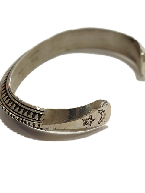 ナバホアーティスト[Wylie Secatero(ワイリー セカテロ)]の作品。ボリューム満点のトライアングルバングルには繊細なスタンプワークが施されています。側面から見た時のバングルの厚みが約7mmと肉厚、幅も10mmとシンプルなトライアングルバングルとしてはヘビーゲージで仕上げ、つけた時のインパクトがあります。