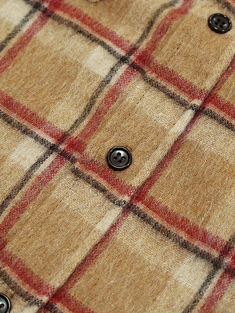生地にはウール65%、ナイロン3%、アクリル3%、ポリ25%、レーヨン1%、のウールの混紡生地を使用。保温性もあり着心地の良い生地感となっています。合わせやすいベージュベースカラーにレッドとブラックの配色、表面が起毛でややぼやけたチェックがまた良い塩梅で非常に良いカラーです。
