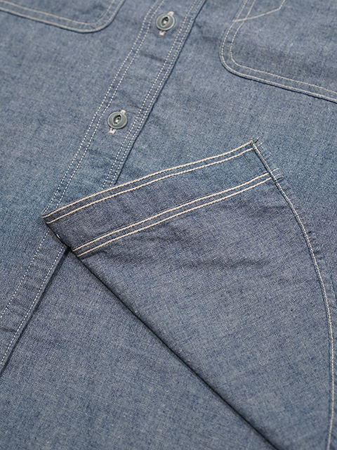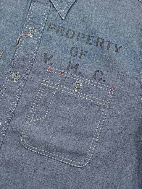 30年代のOLDシャンブレーシャツをベースに各部をリファインしました。旧式力織機を使いヴィンテージのシャンブレーシャツをリプロダクトした5oz.のセルビッチシャンブレー素材を採用。程よいムラ感と黄色味がかった色味を再現しています。管縫いの裏糸グリン色糸使いやマチの耳使い、カラ管止めや細巻き、細運針使いなど、2〜30年代に見られる特徴的なメタル釦を採用しています。左ポケット上部にはVMC予備校のステンシル入り。