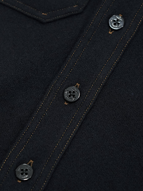 素材は肉厚なウールメルトン生地を採用。ウールをベースにナイロンなどを混紡し、圧縮された遮風性・防寒性に優れた機能的な素材。シャツとしてダウンベスト等と重ね着、ジャケットとしてスウェットやシャツ等に羽織るのもオススメです。