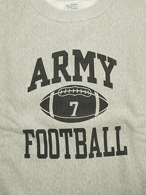 プリントデザインは[ ARMY FOOTBALL ]。1802年に、ニューヨーク州のウエストポイントに設立された陸軍士官学校は米国で最も古い士官学校。陸軍士官学校と永遠のライバルでもある海軍士官学校のカレッジフットボールの試合は米国では伝統の試合となっている。シンプルなブロック体にフットボールが効いたスポーティーなプリントデザイン。染込みプリントは着込み、洗濯を繰り返す事で褪色し、ビンテージのような風合いに変化していきます。