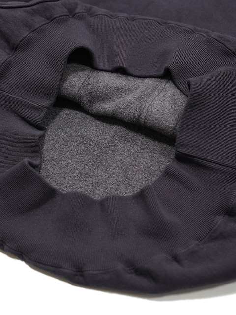 オリジナルの裏起毛スェット素材は"Vintage Wash"をかけ質感を向上させています。裏⽑のループはタオルの様なパイル形状で編み込む事により⽷の間に空気を含ませ快適な着⼼地と保温性が有り吸⽔性から蒸れにくい素材になっております。身頃の生地をリバースウィーブのように横使いにし、縦方向への縮みを軽減しています。