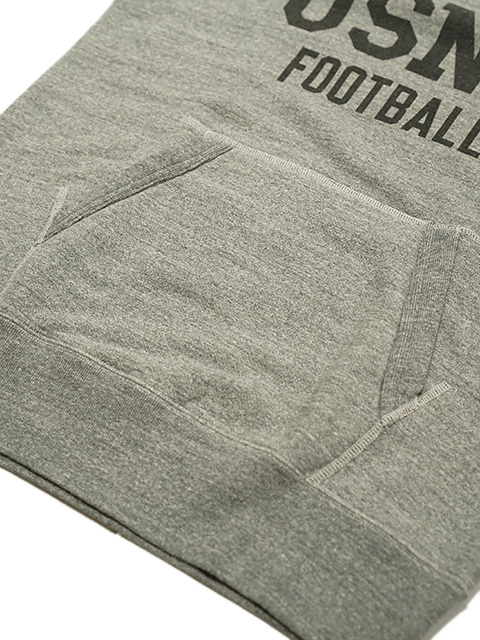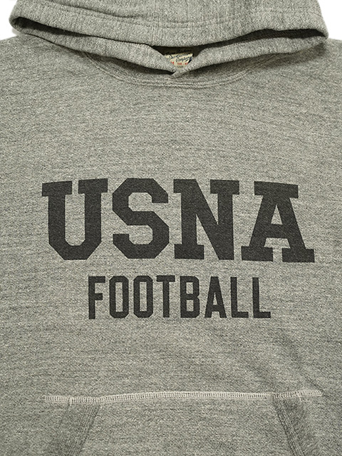 プリントデザインは「USNA FOOTBALL」。United States Naval Academy(米海軍と米海兵隊の土官学校)の頭文字で[USNA]、そのフットボールチームで着用されていたトレーニングウェアのデザインでになります。太めのブロック体が染込みプリントされ古めかしさを醸し出しています。