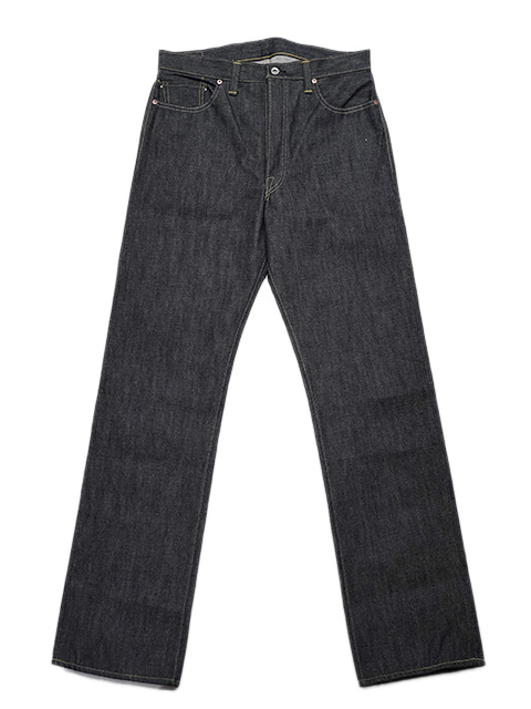 ジーンズデザインは「大戦モデル」を再現。こちらは大戦モデルらしいワタリから裾にかけてストンとしたシルエットの「ワイド」タイプ。軍汎用の鉄製ドーナツボタン、鍋底型の鉄製ツープロング、銅メッキされた鉄リベットの使用など、パーツ類にもかなりの拘り。第二次大戦期の戦況上、米国内産業の物資統制が最も過酷を極めたモデル。コインポケットのリベットは省略され、また袋地にはオリーブヘリンボーン生地が使用されています。そして大戦モデル特有のオールイエローステッチ、熟練工不足からか縫製が非常に粗雑で、ステッチの幅が一定ではない、ピッチ幅が広めで荒い縫製仕様も再現しています。
