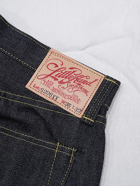生地は新作の【 14.5oz 】 リトルハンドオリジナルデニム生地(LH7)を使用。縦横の糸番手、糸の撚り、打ち込み、染色回数など、Little Hand 村瀬氏の思う大戦期のデニムをイメージし作り上げたオリジナルデニム。生地表面は凹凸感があり荒々しい表情。大戦期に見られる黒味のあるデニムは濃淡の強い色落ちを味わう事ができます。