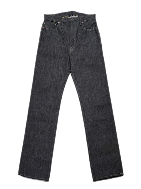 ジーンズデザインは「大戦モデル」を再現。こちらはヴィンテージの1947モデルを解体して起こした型紙を使用した、ワタリから裾にかけてほんのりとテーパードが入るシルエットの「スタンダード」タイプ。軍汎用の鉄製ドーナツボタン、鍋底型の鉄製ツープロング、銅メッキされた鉄リベットの使用など、パーツ類にもかなりの拘り。第二次大戦期の戦況上、米国内産業の物資統制が最も過酷を極めたモデル。コインポケットのリベットは省略され、また袋地にはオリーブヘリンボーン生地が使用されています。そして大戦モデル特有のオールイエローステッチ、熟練工不足からか縫製が非常に粗雑で、ステッチの幅が一定ではない、ピッチ幅が広めで荒い縫製仕様も再現しています。