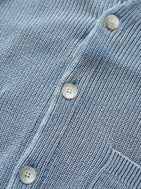 デザインは長年使える飽きの来ないシンプルなカーディガンで、フロントは4つボタン仕様、フロントにポケットが付きます。カーディガンとしては厚手過ぎずサラッと羽織やすいので、カットソーやシャツ等との重ね着、その上からアウターを着たりと長いシーズン活躍するトップスです。