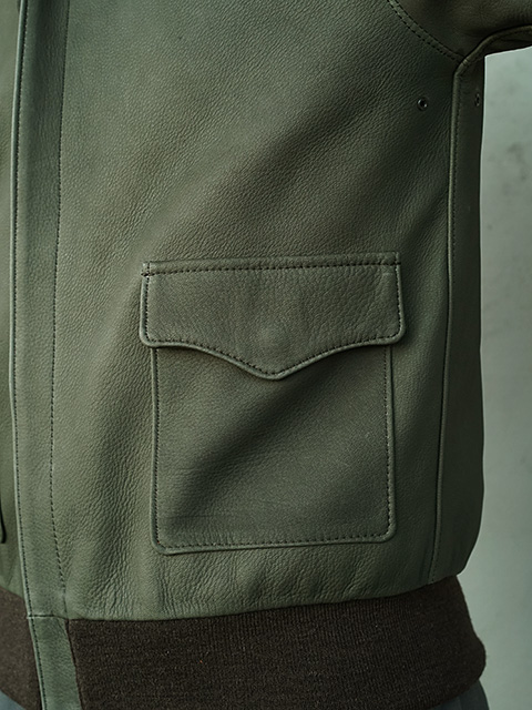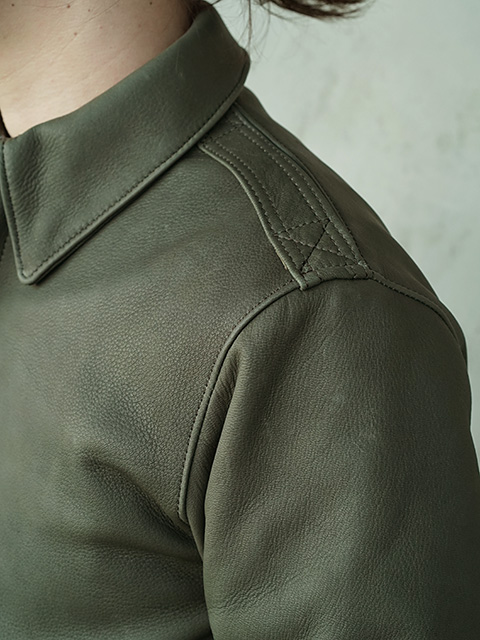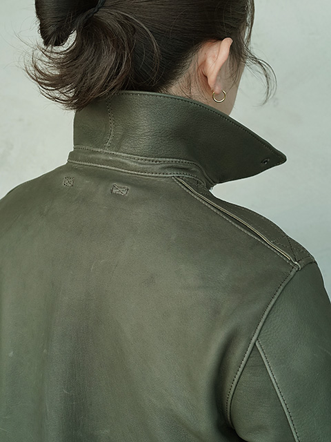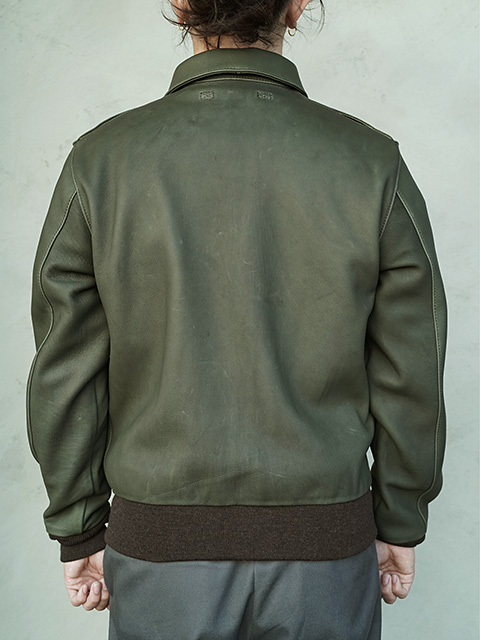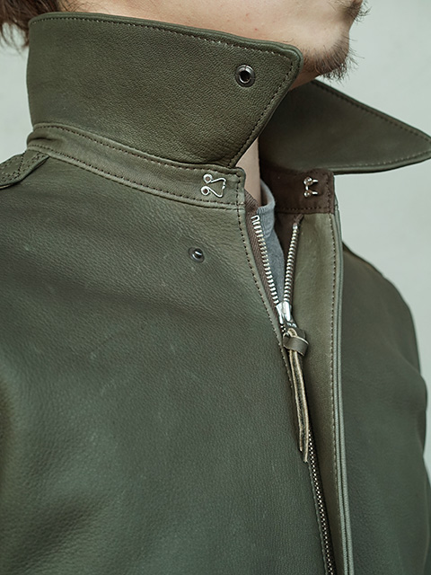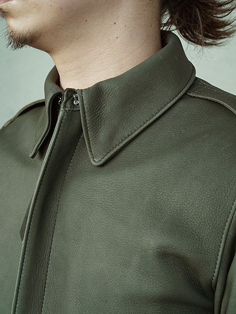デザインはミリタリーレザージャケットの代表格“TYPE A-2”。1940年代のヴィンテージ"A-2"をサンプリングし製作。完全再現するのではなく、ヴィンテージに敬意を払いつつ、台襟、ポケットのデザインなど細かな修正に加え、各パーツのサイズ感も見直しまし、1stサンプル、2ndサンプルと何度もサンプルを作り直し、オリジナル同様、身幅にはややゆとりあるものにしながらも、すっきりとしたシルエットに見えるような色気のあるレザージャケットに仕上がっています。